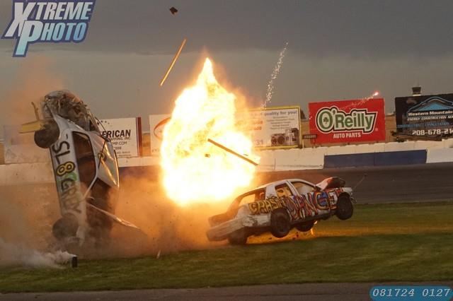 A full night of chaos and carnage blew into Magic Valley Speedway on Saturday, August 17, as Eve of Destruction II presented by Quale's Electronics took over the third mile asphalt oval. The Western Mountain Inc. NASCAR Latemodels, McDonald's Street Stocks, Pepsi Sprintcars, Magic Valley Speedway Hornets, Budweiser Bombers, Pepsi Mini Stocks, and Apex Idaho drifters joined forces to provide the racing thrills while the rest of the night was devoted to all forms of crashing and smashing.